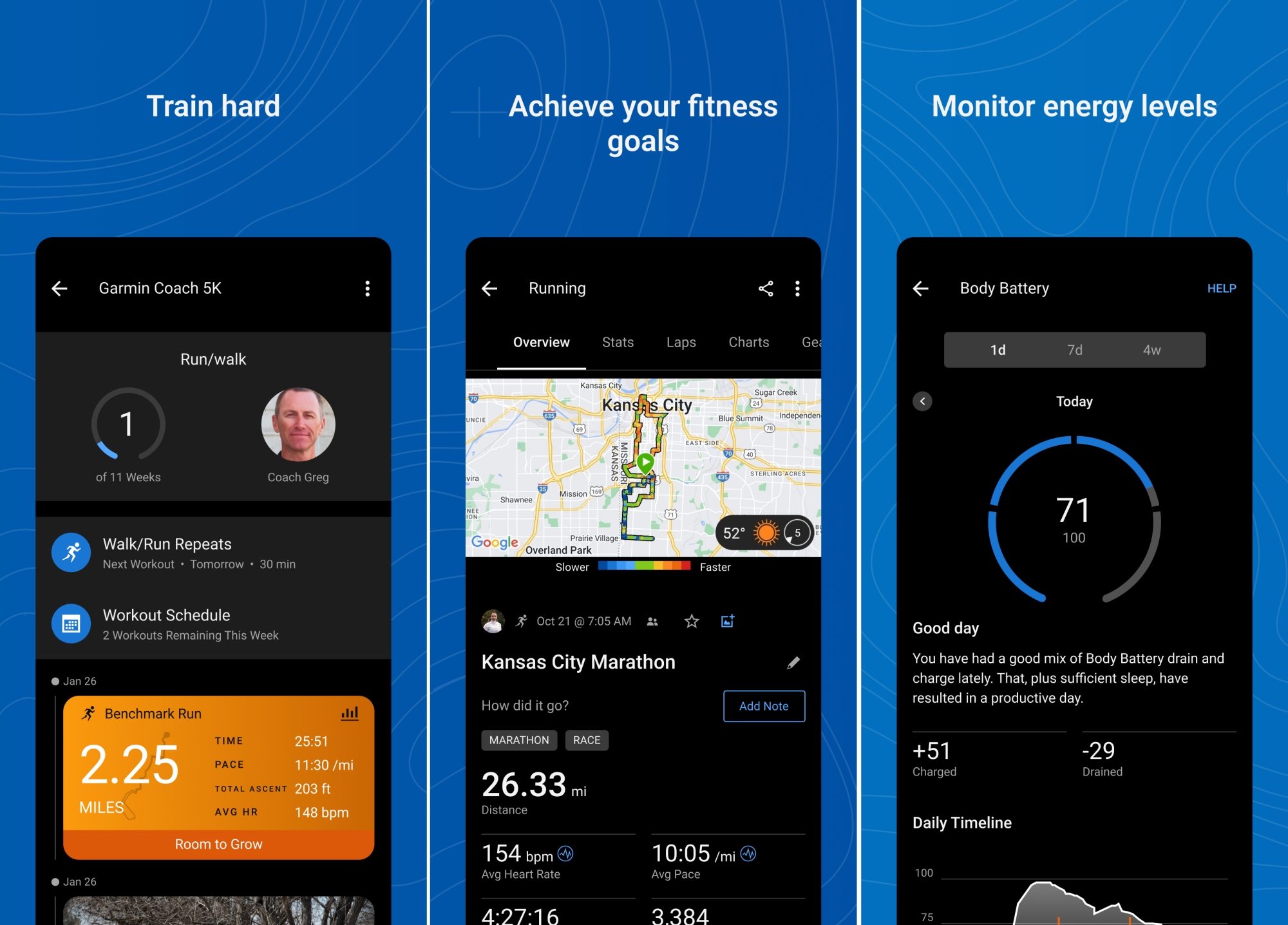 Veľmi podobné funkcie ponúka aplikácia Garmin Connect (Android, iOS), ktorá ale slúži primárne na analýzu dát z Garmin zariadení – hodiniek a cyklopočítačov. Niektorí majitelia si ju obľúbili viac než Stravu najmä vďaka funkcii Garmin Coach, ktorá odporúča, aký dlhý, intenzívny a rýchly by mal byť váš ďalší tréning, ak trénujete napríklad na polmaratón alebo maratón. Zaujímavá je aj funkcia Body Battery a analýza ďalších metrík pripravenosti na výkon ako je napríklad variabilita srdcovej frekvencie (HRV).