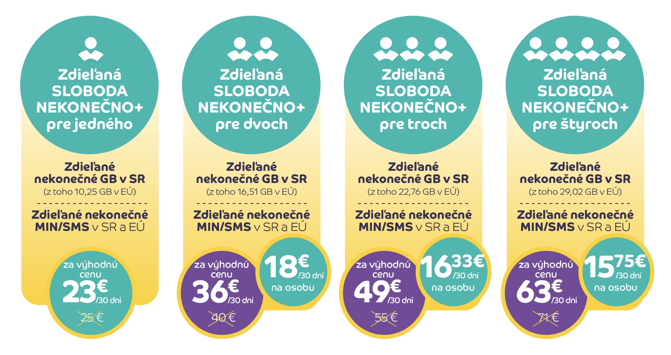 V cene má zdieľané nekonečné dáta s neobmedzeným počtom GB v SR a neobmedzený objem voľných minút a SMS v SR a EÚ.