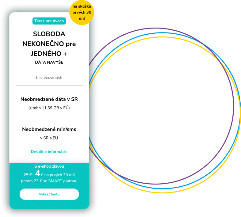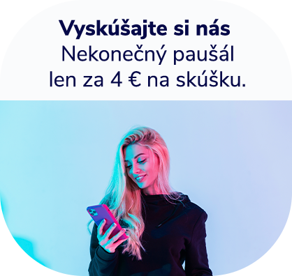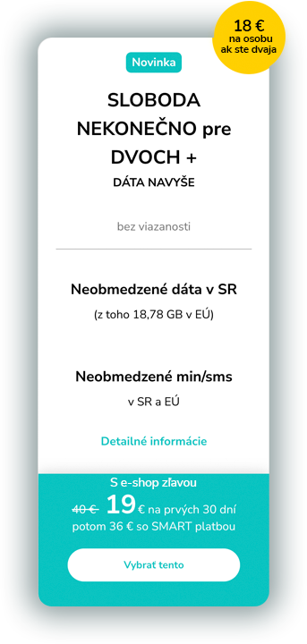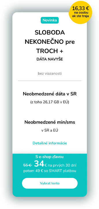 Náš nekonečný paušál SLOBODA NEKONEČNO+ pre jedného za 23 €/30 dní so SMART platbou obsahuje neobmedzené minúty alebo SMS v SR a EÚ, neobmedzené dáta v SR, z toho 9,39 GB v EÚ a úplne bez viazanosti. Viac o našom nekonečnom paušále tu.